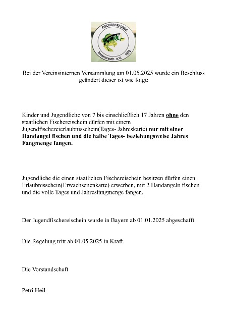 Jugendaktivitäten 2026: Die neuen Termine sind unter der Rubrik "Termine Fischerjugend 2026" ersichtlich. Nähere Informationen und Anmeldung bitte direkt beim Jugendwart Richard Schmidt unter 0151/11168141.