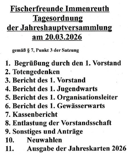 Jahreshauptversammlung 2026: Die diesjährige Jahreshauptversammlung fand am Freitag, 20.03.2026, um 19.30 Uhr im Black Pub in immenreuth statt. Die dazugehörige Tagesordnung siehe nächster Absatz. Bezüglich der Neuwahlen wurde die neue Vorstandschaft unter der Rubrik "Vorstandschaft" geändert. Wir bedanken uns für die rege Teilnahme.